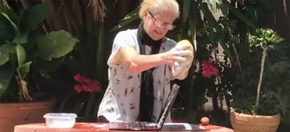 “Mi abuelita le quitó los virus a mi laptop”, menciona en el video, mientras de fondo se observa como la persona mayor edad con una gran esponja restriega una esponja llena de jabón en el teclado del PC.